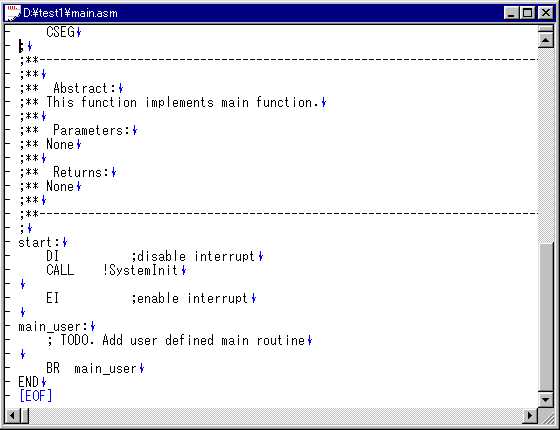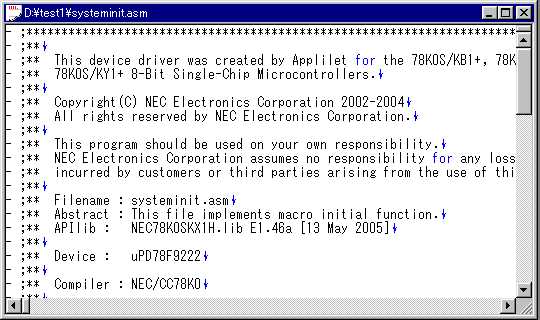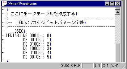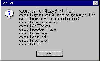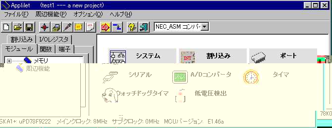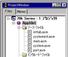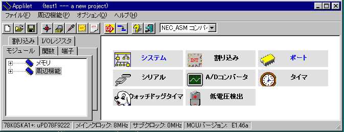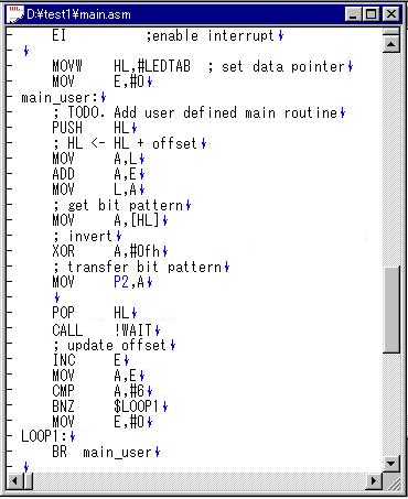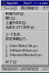 哲 :押忍。来たぞ。今日こそ、Appliletを使うんだよな。 啓二:何だ、息を切らして。ロボを連れてこいよ。 哲 :ロボの方が先かよ。 啓二:慌てるなって。犬は、運動すると、口から放熱して 体温を調整するんだ。だから、水をやらないと倒れて しまう。 哲 :そう言えば、お前、夜に犬を走らせていたよな。 あれは、体温のことを考えてだったんだ。 啓二:そうさ。昼は、車も多くて、走りにくいことも理由だが。 犬も人間も、バテないで、運動しようと考えると、夜走る のが、いちばんだったんだ。ロボの水だ。 哲 :おーい、こっちにも水くれ。 啓二:そうだなあ。氷を入れるか。 哲 :そうしてくれ。口に含んで、乾きも癒せる。 啓二:よし、よし。じゃあ、今日は、Appliletを使って、LED 点灯テストプログラムを作ろうか。 哲 :待ってました。 あっと、先週ディレイを入れるというのがあったぞ。 啓二:ああ、そうだったなあ。こんな程度のサブルーチンで充分だ。 WAIT: PUSH AX PUSH DE MOVW DE,#0ffffh WAIT0: DECW DE WAIT1: MOV A,D CMP A,#0 BNZ $WAIT2 MOV A,E BNZ $WAIT2 BR $WAIT_EXIT WAIT2: BR $WAIT0 WAIT_EXIT: POP DE POP AX RET 哲 :いつか、聞こうと思っていたんだが、どうして、そう パッとコードが出てくるんだ。78kは、使って日が 浅いんだろう。 啓二:ああ、そういうことか。Z80のアセンブリ言語を 一度脳みそから汗がでるくらいにやったからさ。 さあ、ノートPCの前に座ってくれ。 哲 :ほい。 啓二:デスクトップ画面にある、Appliletアイコンをダブル クリックして、起動する。 哲 :これだな。VC++の開発環境と同じような、画面だな。