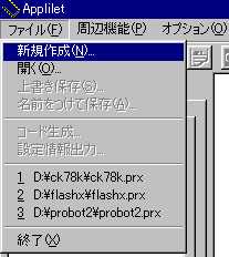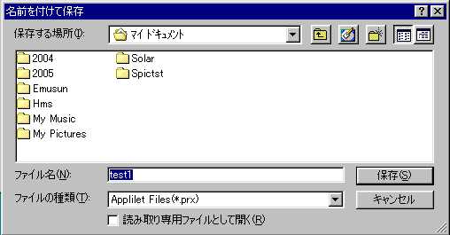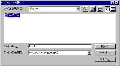 哲 :「ワークスペース」なんて、作ってないぞ。 啓二:Appliletが作った「ワークスペース」を保存しただろう。 あれを使うんだ。 哲 :そうなんだ。「test1.prw」になってんだ。 「開く」をクリックしてっと。