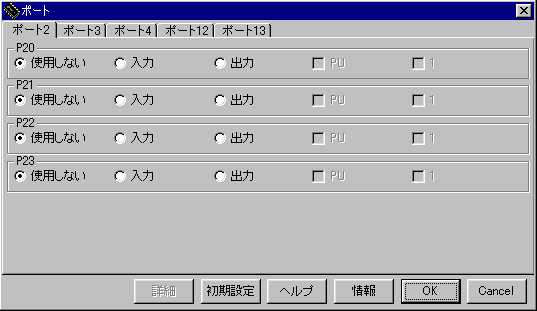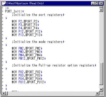 サブルーチンを呼出して、初期化しているようだ。 啓二:Appliletは、ポートの方向、初期値をビットパターンで 定義して、それをMOV命令で内部のレジスタに設定して いるだけなんだ。 さっき、ダイアログボックスでチェックを入れたろう。 あのチェックを元にして、ビットパターンを生成するのさ。 今度はportをクリックし、内容を表示してみろ。 哲 :ああ、初期化命令の嵐だ。
