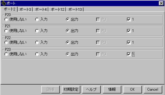 啓二:ポート2には、LEDを接続するので、出力に設定する。 マウスで、チェックを付けるとよい。初期値も必要だから 1にもチェックを入れよう。