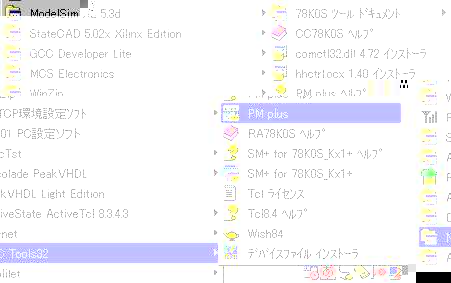 啓二:そのまま、OKボタンをクリックする。 ここまでで、必要な内容を記述したファイルを作成 した。今度は、アセンブリ言語プログラム入力だ。 哲 :何か簡単過ぎて、気味が悪いんだが。 啓二:VC++の開発環境に慣れているからだろう。 マイコンならば、即座に終了するさ。 今度は、「スタート」から「PM Plus」を起動する。